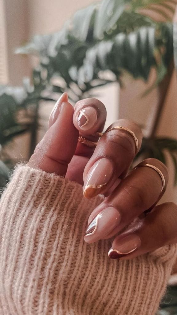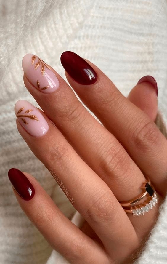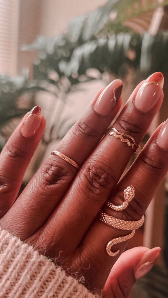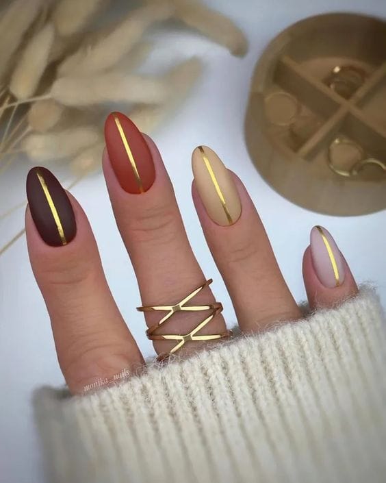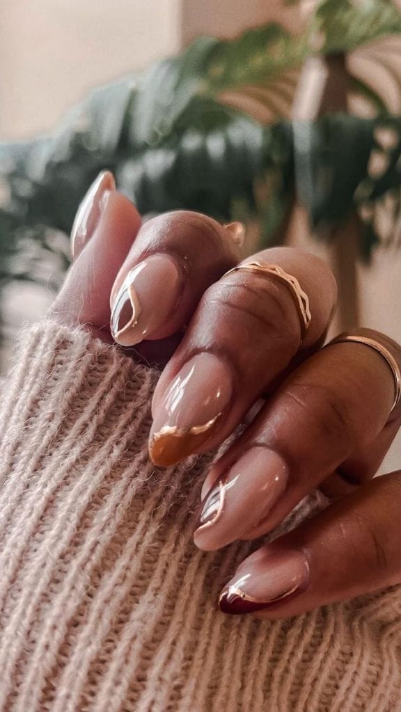 Try a minimalist nail design with negative space and a single accent nail in a rich fall color. Leave part of the nail unpainted to create a negative space effect, and paint one nail in a bold fall color to make it stand out.